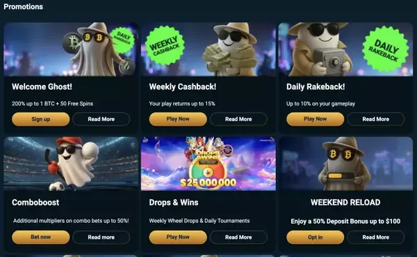 Οι τακτικοί παίκτες μπορούν να χρησιμοποιούν εβδομαδιαίο cashback και καθημερινό rakeback, και τα δύο υπολογίζονται από τη δραστηριότητα και τα καθαρά αποτελέσματα μέσα στην καθορισμένη περίοδο. Το Weekly Cashback επιστρέφει έως 15% των εβδομαδιαίων καθαρών απωλειών, ενώ το Daily Rakeback μπορεί να φτάσει έως 10% σε κάθε ποντάρισμα που τοποθετείται, ανάλογα με το επίπεδό σας και τους κανόνες της συγκεκριμένης προσφοράς. Τρέχουμε επίσης μπόνους κατάθεσης Spectral Reload σε συγκεκριμένες ημέρες, που μπορεί να είναι χρήσιμα αν προτιμάτε προγραμματισμένες συνεδρίες αντί για εφάπαξ προσφορές. Οι παίκτες Sports μπορούν να διεκδικήσουν Sports Welcome Bonus 200% στην πρώτη κατάθεση για στοίχημα συν ένα Δωρεάν Στοίχημα €5, και να χρησιμοποιούν Combo Boost για παρολί (accumulator) με 4 ή περισσότερες επιλογές. Όπως με κάθε μπόνους Ghostino, το ταμείο και η σελίδα προσφοράς δείχνουν τι μετράει και τι όχι.