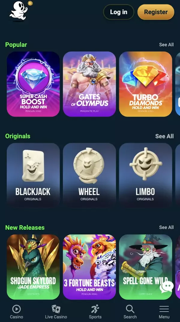 - Ghostino Casino ποικιλία παιχνιδιών: Originals, κουλοχέρηδες, live τραπέζια, game shows και πλήρες Sports σε ένα mobile lobby.